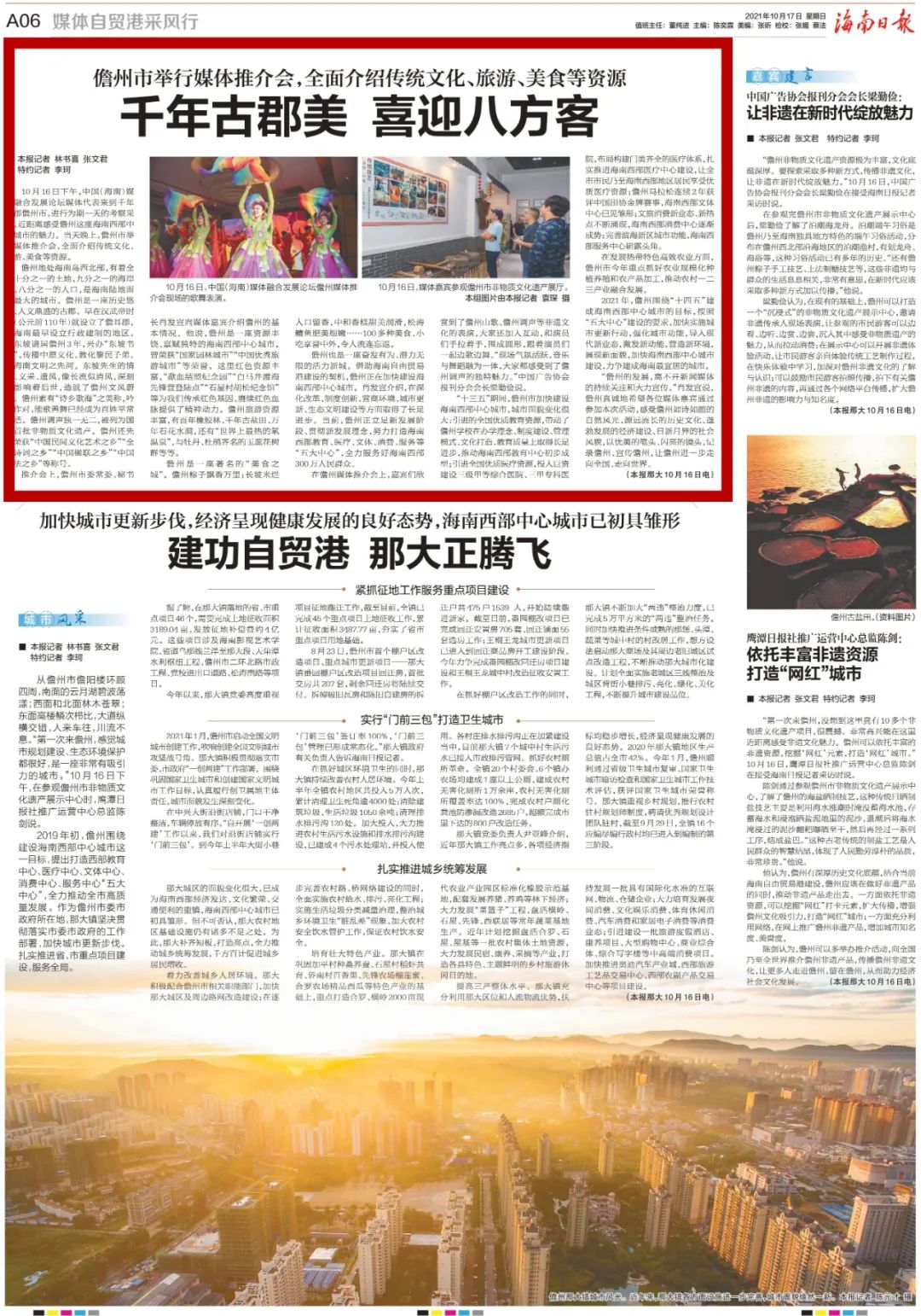 今天,海南日报A06版以《千年古郡美 喜迎八方客》为题,报道儋州举行媒体推介会,全面介绍传统文化、旅游、美食等资源。