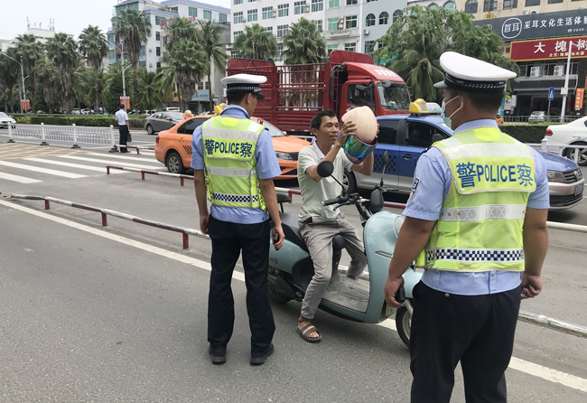 民警耐心劝导一市民正确佩戴安全头盔。 儋州融媒全媒体记者 王家隆 摄